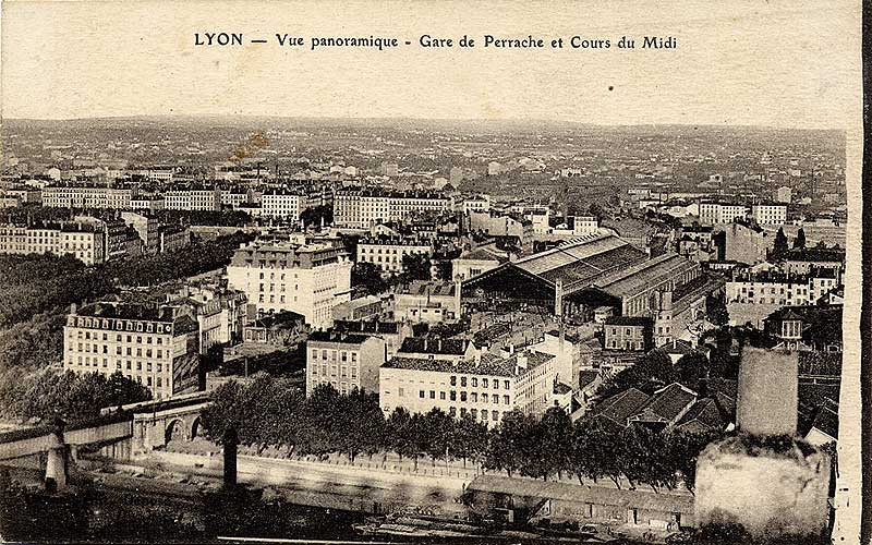 Vue panoramique de la gare de Perrache et du cours du Midi avant la construction de l'usine postale, carte postale entre 1890 et 1900. Lyon, collection particulière