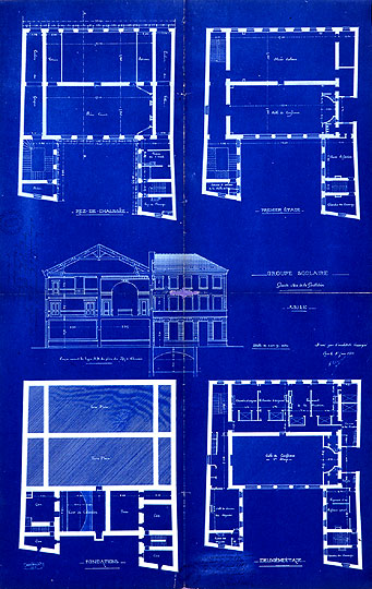 Groupe scolaire Veyet, grande-rue de la Guillotière, architecte Bellemain, plan des différents niveaux, coupe, 1883, éch. 1:100e, tirage au ferrocyanure de potassium appelé bleu d'atelier ou ferroprussiate.