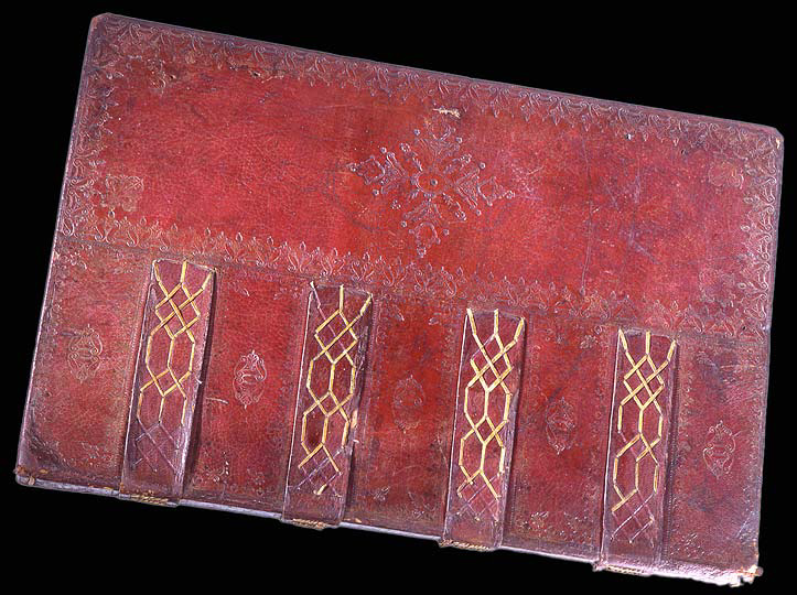 Maquette de reliure lyonnaise pour un marchand parisien, vers 1730, maroquin, lanières de vélin, encadrement de petits fers à froid sur les plats avec fleuron central. Lyon, Archives municipales, II 279