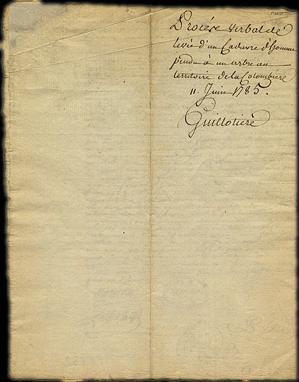 Un homme pendu au territoire de la Colombière (faubourg de la Guillotière), 11 juin 1785, procès-verbal de levée de cadavre. Lyon, Archives municipales, FF 732