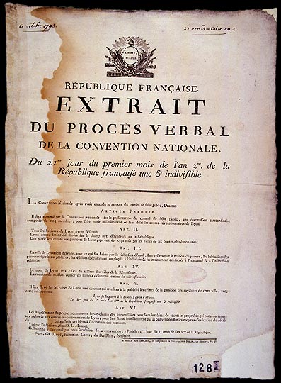" Lyon n'est plus ", décret de la Convention Nationale, 21 vendémiaire an II (12 octobre 1793), affiche administrative. Lyon, Archives municipales, 936 WP 1 p.128