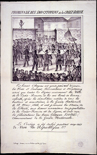Promenade des 580 citoyens de la Croix-Rousse, lithographie par Cotton, 1848. Lyon, Archives municipales, 16 FI 459 M