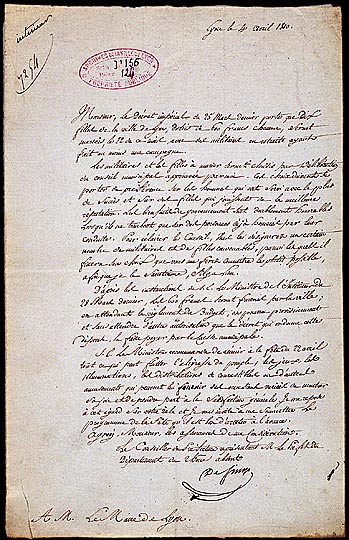 Lettre du conseiller de la préfecture du Rhône au maire de Lyon au sujet des époux dotés par la Ville, 4 avril 1810. Lyon, Archives municipales, 1 I 156 p.124
