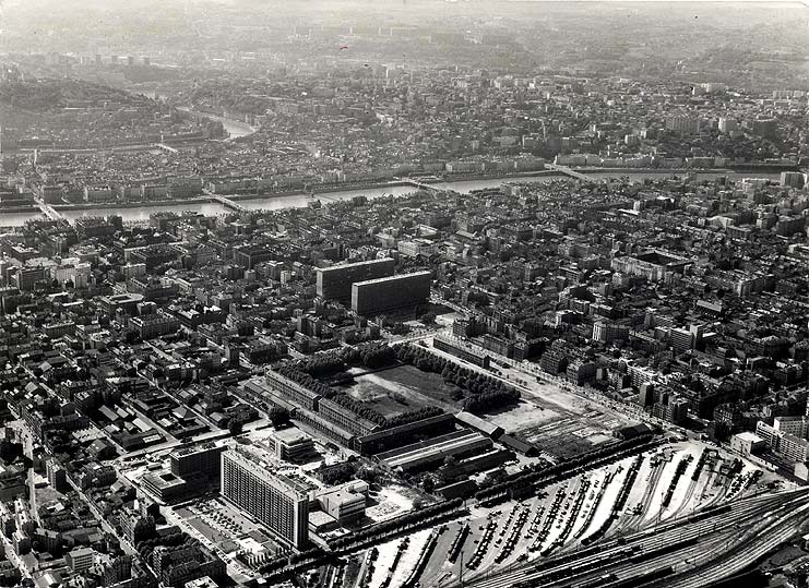Vue aérienne de la ville de Lyon et du quartier de la Part-Dieu avant sa restructuration, vers 1965-1966, cliché anonyme. Lyon, Archives municipales, 111 II 24