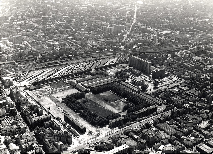 Vue aérienne centrée sur l'ancienne caserne de la Part-Dieu, vers 1965, cliché anonyme. Lyon, Archives municipales, 111 II 24