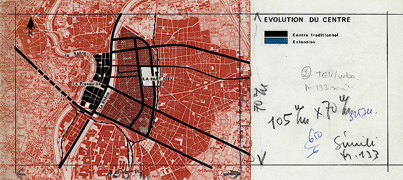 Évolution du centre, projet pour la restructuration du quartier de la Part-Dieu, plan dressé par Charles Delfante, architecte urbaniste, vers 1965, manuscrit sur calque. Lyon, Archives municipales, 111 II 21