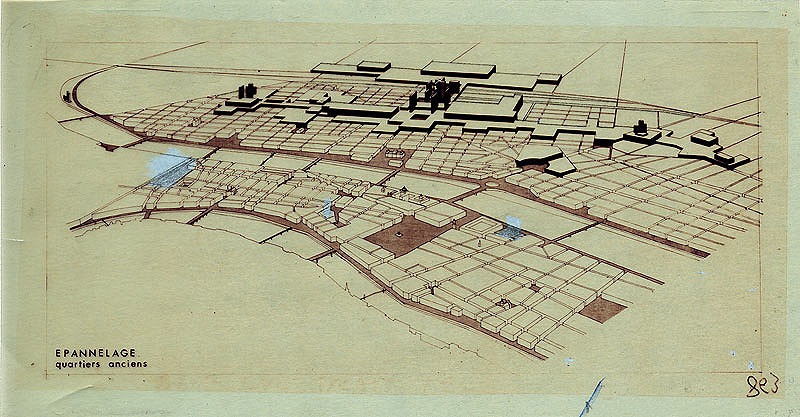 Épannelage, projet pour la restructuration du quartier de la Part-Dieu, dressé par Charles Delfante, architecte urbaniste, vers 1965, manuscrit sur calque. Lyon, Archives municipales, 111 II 21