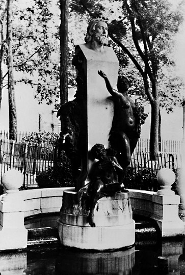 Jardin des Chartreux, monument à Pierre Dupont (1821-1870), allégorie de la Chanson, génie jouant du syrinx et chèvre, par Auguste Suchetet, 1899.