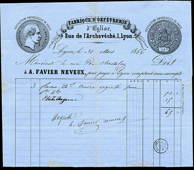 Mémoire établi par A. Favier-Neveux, orfèvre lyonnais, 31 mars 1866. Lyon, Archives municipales, 5 FI P 17