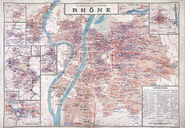 "Les cartes industrielles de France : Rhône", plan de situation des industries à Lyon, dressé par Saint-Denis, géomètre, édité par la société de Documentation industrielle, 1932, éch. diverses, imp.