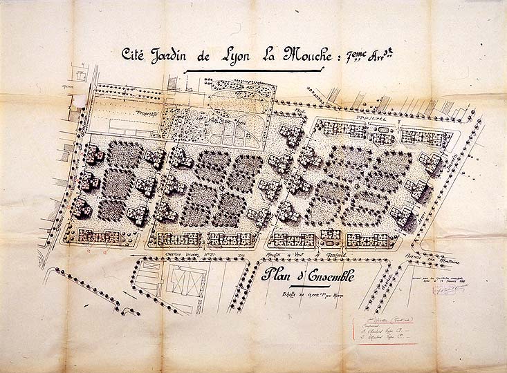 Cité jardin de la Mouche à Gerland, plan général du lotissement, architectes Robert et Chollat, 1923, éch. 1:500e, tirage d'architecte et rehauts manuscrits.