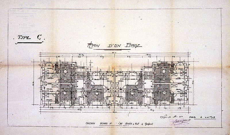 Cité jardin de la Mouche à Gerland, type C, plan d'un étage, architectes Robert et Chollat, 1924, éch. 1:100e, tirage d'architecte. Lyon, Archives municipales, 2 S 1186
