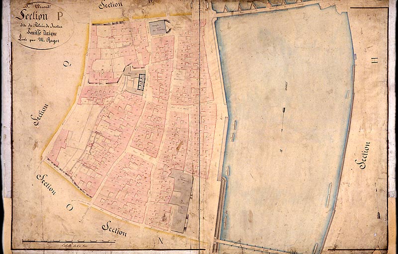 Cadastre du 5ème arrondissement de Lyon, section P, levée par Ragot, 1830-1832, éch. 1:600e, manuscrit aquarellé. Lyon, Archives municipales, 1491 Wp 255
