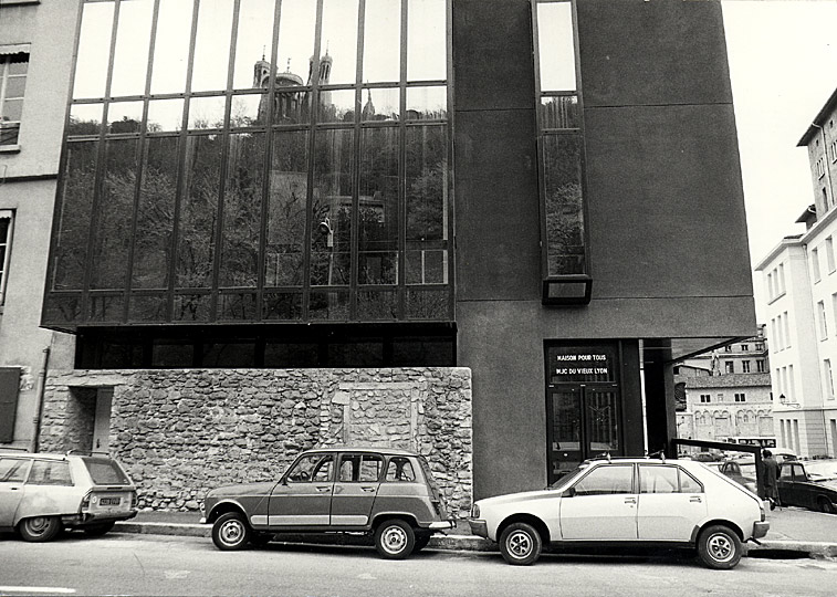 Maison de quartier après les travaux de réhabilitation, vue prise à l'angle de la rue de la Brèche et de la rue Tramassac, avec le mur du cloître Saint-Jean (XIIe siècle), 1983, cliché J. Gastineau / A.M.L.