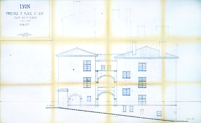 Immeuble sis au n° 5 place Saint-Jean, premier projet d'aménagement (non réalisé), architecte A.-J. Donzet, 1968, éch. 1:50e, tirage d'architecte. Lyon, Archives municipales, 916 Wp 19