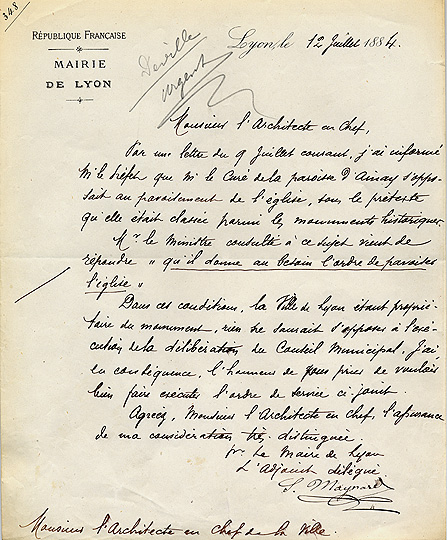 Lettre de Maynard, adjoint au Maire, à l'architecte en chef de la ville de Lyon, au sujet du pavoisement de l'église Saint-Martin d'Ainay pour le 14 juillet, 12 juillet 1884.