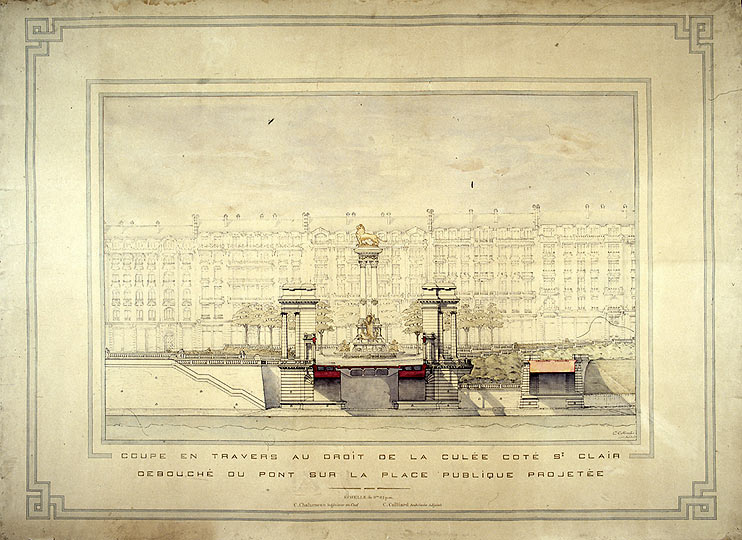 Projet de pont sur le Rhône à hauteur du quartier Saint-Clair, dressé par C. Colliard, architecte adjoint sous la direction de C. Chalumeau, ingénieur en chef de la ville de Lyon, vers 1918, éch. 1:100e, manuscrit.