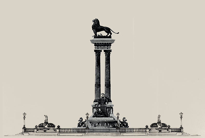 Montage numérique montrant le projet de l'architecte Gaspard André pour l'érection d'un monument à la République (25 septembre 1886 - 2 avril 1887, non réalisé) dans l'entourage du monument prévu par Abraham Hirsch, architecte en chef de la Ville, pour la place Perrache.