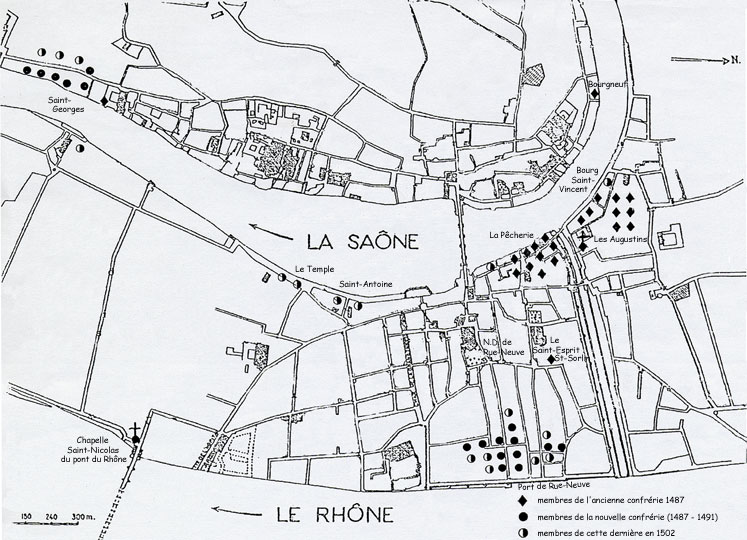 Localisation des membres de l'ancienne et de la nouvelle confrérie Saint Nicolas des riveyrands siégeant respectivement à Lyon, au couvent des Augustins et à la chapelle Saint-Nicolas du Pont du Rhône, entre 1487 et 1502, carte dressée par Jacques Rossiaud.