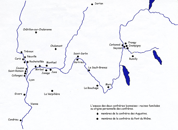 Racines familiales ou origine personnelle des membres de deux confréries lyonnaises Saint-Nicolas des riveyrands, rattachées entre 1487 et 1502, au couvent des Augustins et à la chapelle Saint-Nicolas du Pont du Rhône, carte dressée par Jacques Rossiaud.
