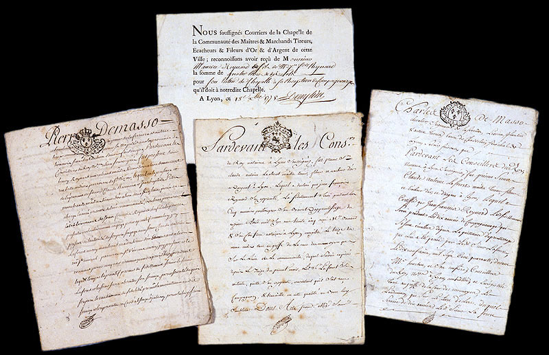 Pièces d'archives relatives à l'apprentissage du métier de tireur dor par des membres de la famille Reynard, ascendants de Jacques Tournier, 1735-1775. Collection particulière