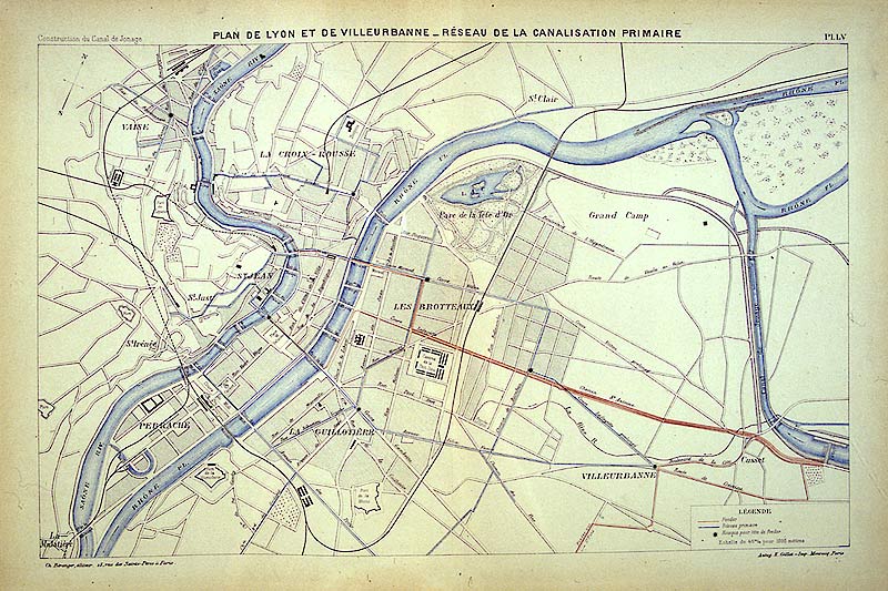 " Plan du réseau de la canalisation primaire ", dans René Chauvin, Construction du Canal de Jonage : travaux, installations hydrauliques et électriques, Paris, Société lyonnaise des Forces motrices du Rhône, 1902.