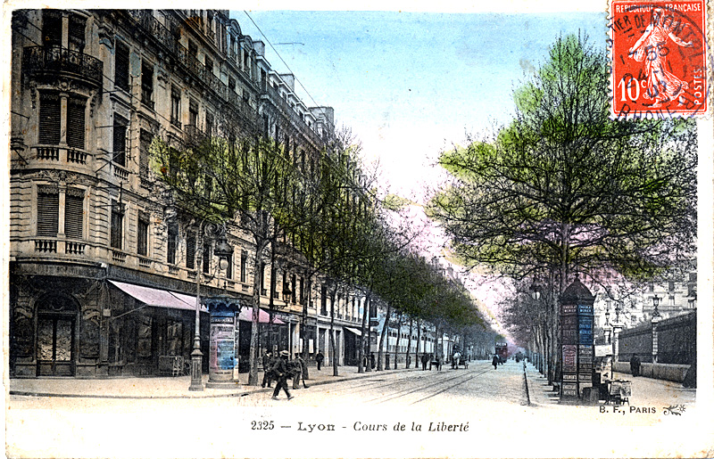 Cours de la Liberté, avec à gauche, un kiosque électrique destiné à l'affichage publicitaire, carte postale, Paris, Éd. B.F., vers 1920. Arras, collection particulière