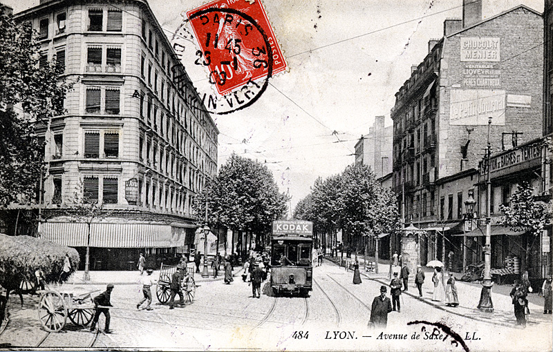 Avenue de Saxe, avec à droite, un kiosque électrique destiné à l'affichage publicitaire, carte postale, [Lyon], Éd. L.L., vers 1900. Arras, collection particulière