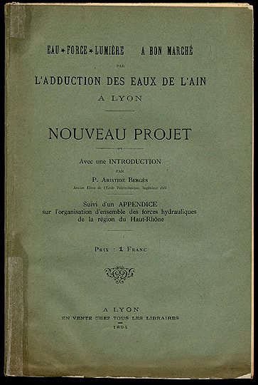 Eau, force, lumière à bon marché par l'adduction des eaux de l'Ain à Lyon : nouveau projet avec une introduction rédigée par P. Aristide Bergès [...], Lyon, Tous les libraires, 1894. Lyon, Archives municipales, 1 C 651072