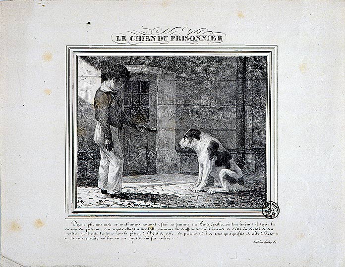 Le chien du prisonnier, lithographie de [Pierre-André] Palley d'après un dessin du peintre A[uguste] F[landrin], vers 1830. Lyon, Archives municipales, 16 FI 53 M