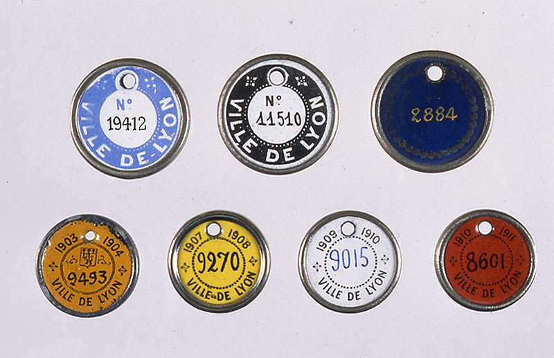 Médailles données aux propriétaires de chiens attestant leur acquittement de la taxe municipale sur les chiens, années 1898-99, 1899-1900, 1902-1903, 1903-1904, 1907-1908, 1909-1910, 1910-1911. Lyon, Archives municipales, 1645 Wp 7